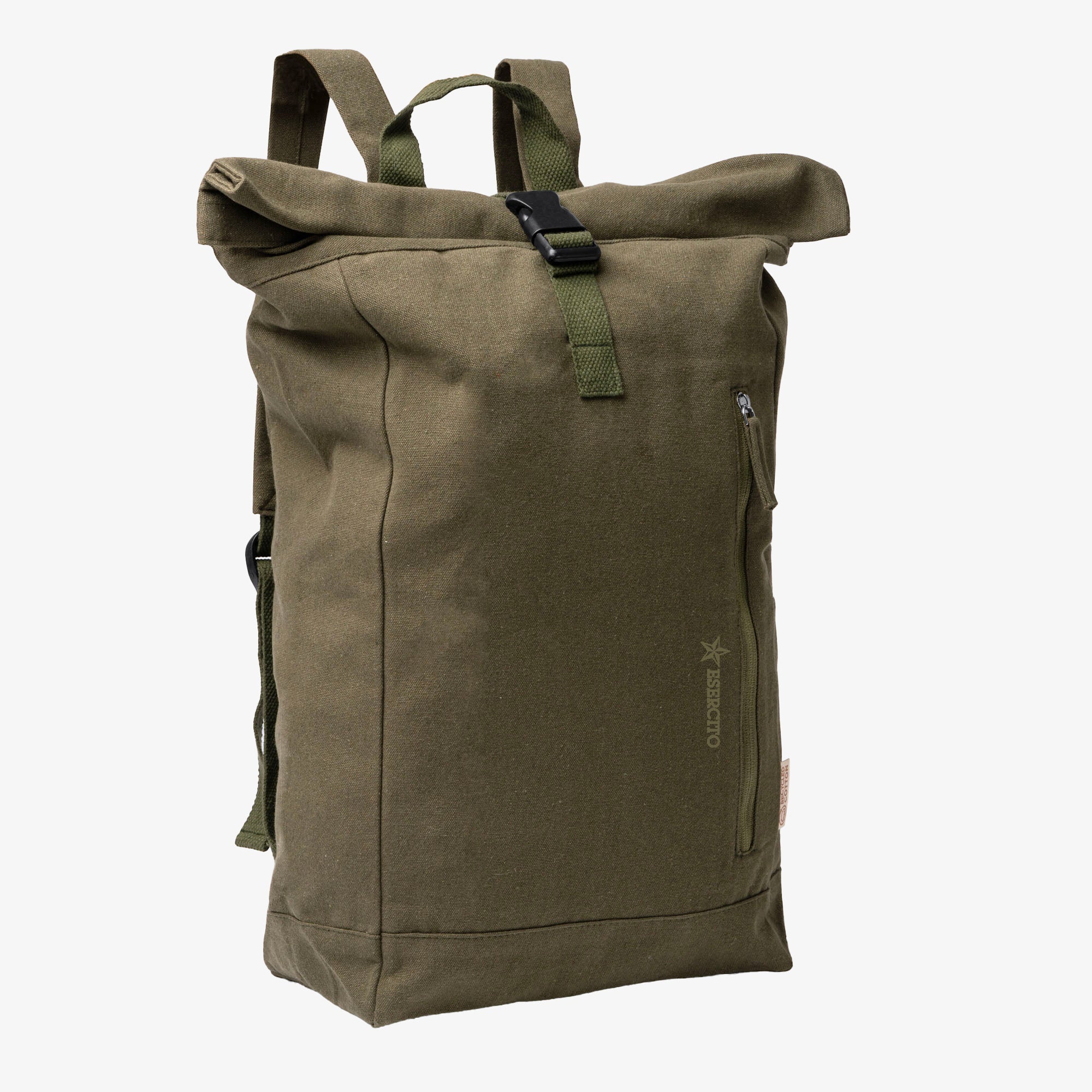 Zaino in cotone riciclato da 370 g/m². Ampio scomparto principale con apertura allungabile con zip e regolatore. Tasca frontale con chiusura a zip e tasca laterale. Capacita': 25L. Ricamo Esercito.