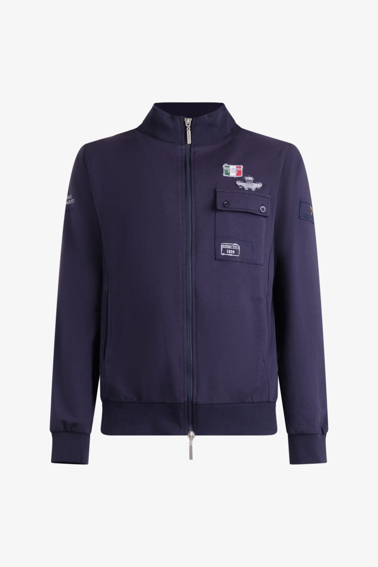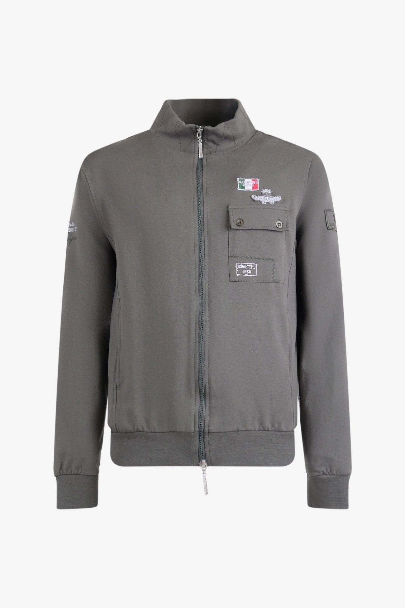 Felpa Uomo con zip frontale, dal sign moderno e deciso, arricchito da dettagli ricamati e patch identificativi. Sul petto e' presente una tasca applicata con bottoni, impreziosita dal ricamo Esercito. Sopra la tasca spiccano i ricami con bandiera italiana e simbolo Paracadutisti. Sulla manica sinistra e' presente ricamato il logo Esercito su patch in canvas con stelletta in metallo brunito, mentre sull'altra manica la scritta Paracadutisti Folgore. Sul retro e' ricamata la scritta Esercito. Realizzata in cotone elasticizzato, la felpa garantisce comfort, vestibilita' regolare e massima praticita' per l'uso quotidiano. Polsini e fondo a costine assicurano una perfetta aderenza. Perfetta per outfit casual, sportivi e urban, ideale da abbinare a jeans, cargo o pantaloni sportivi.