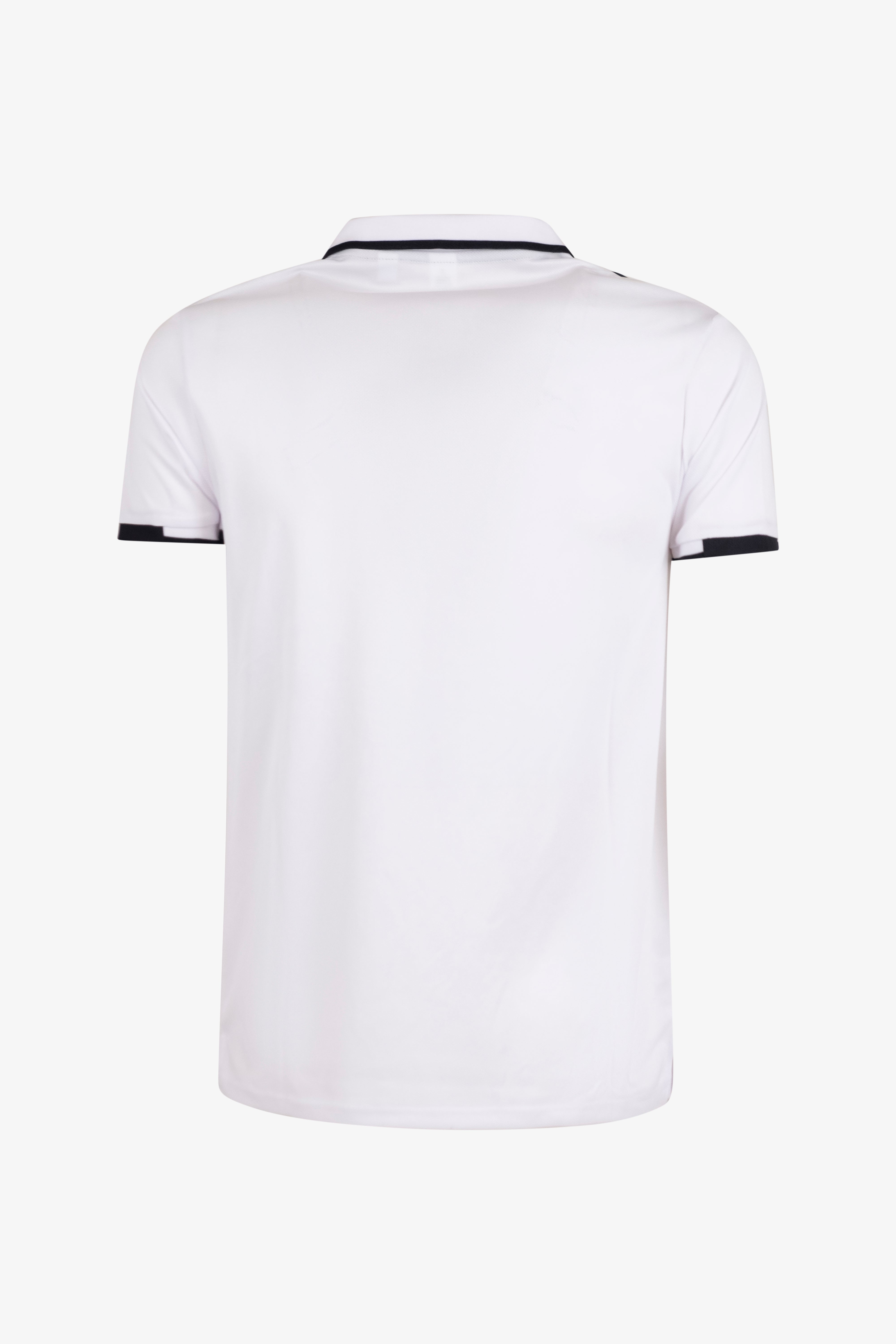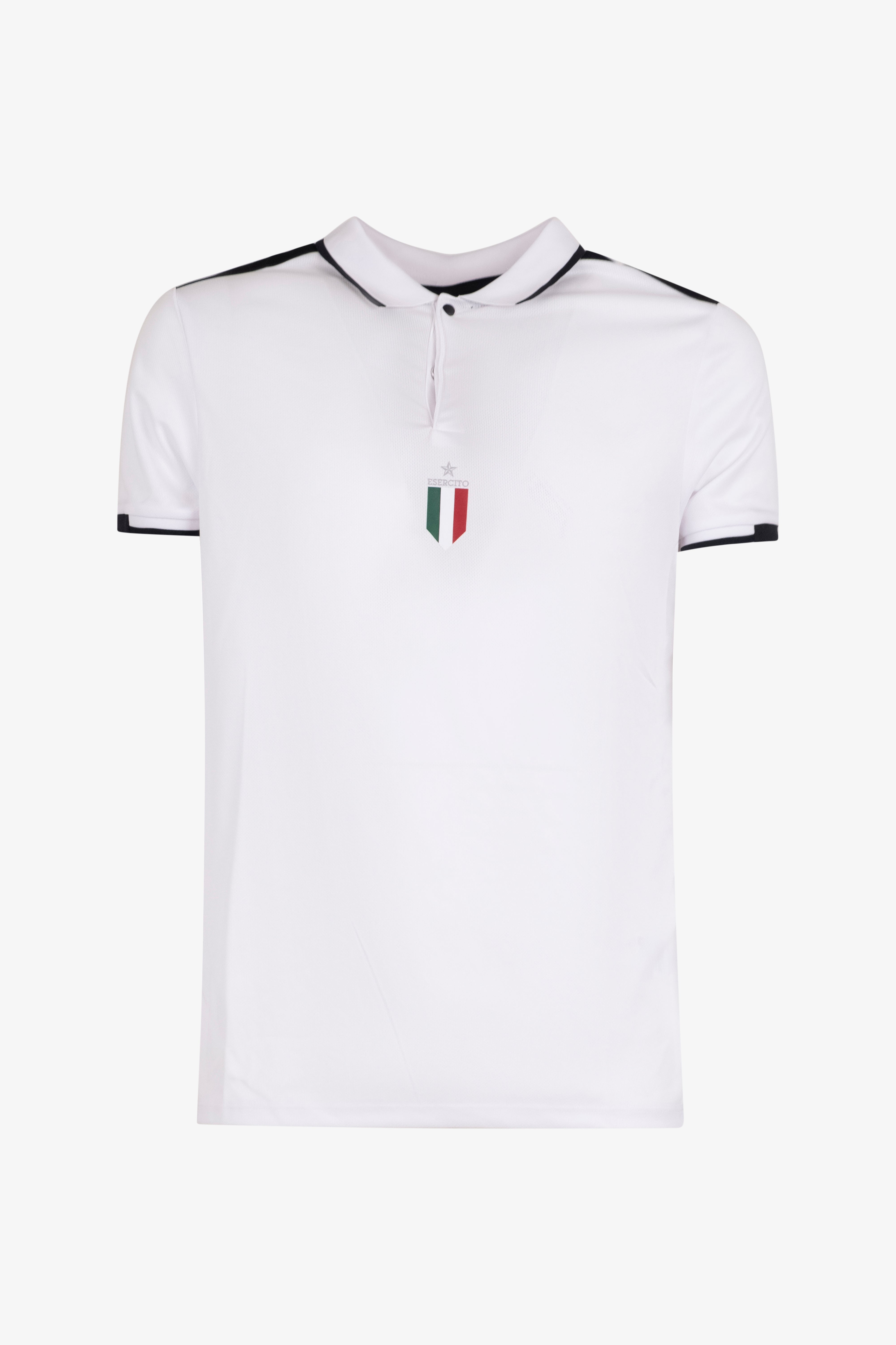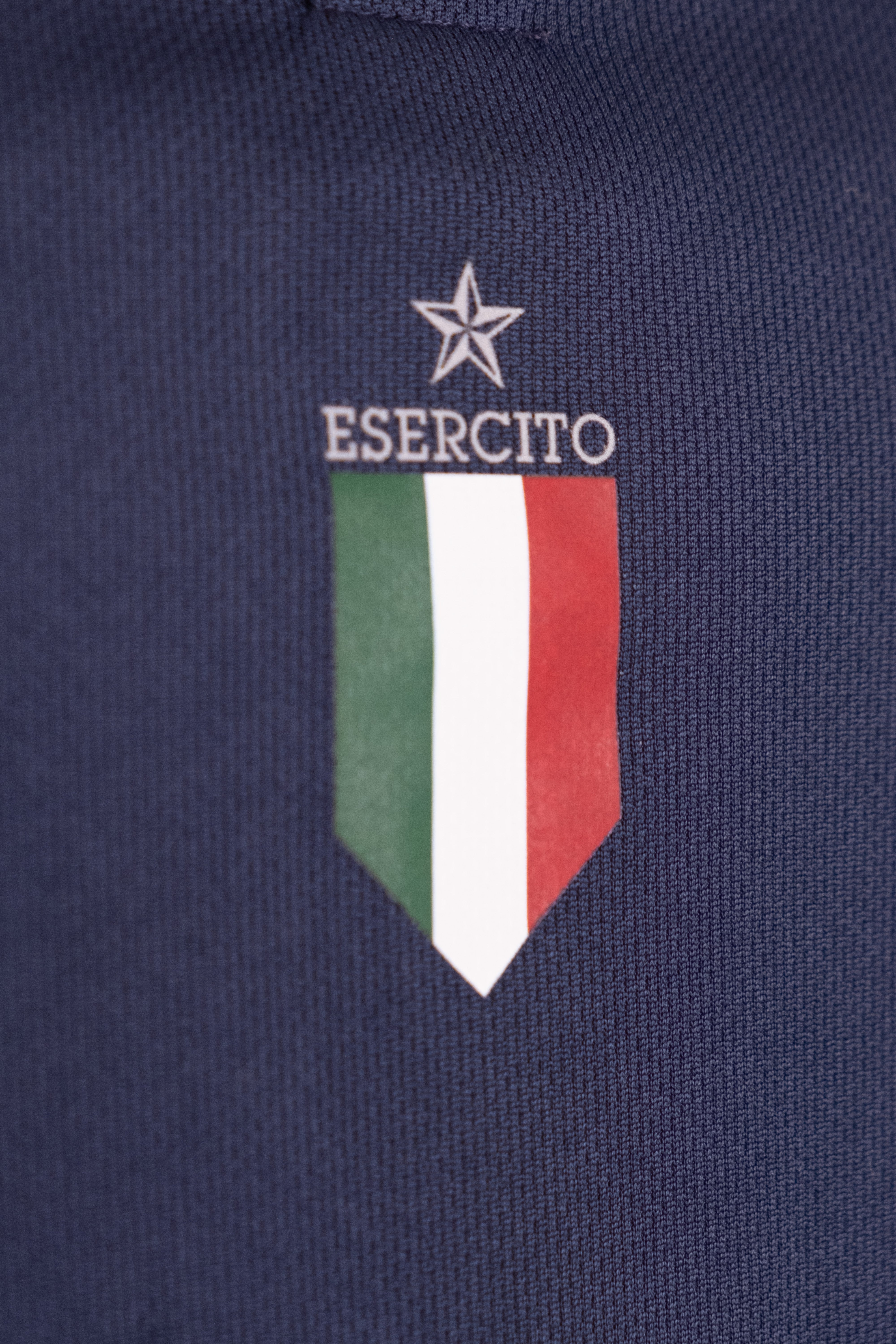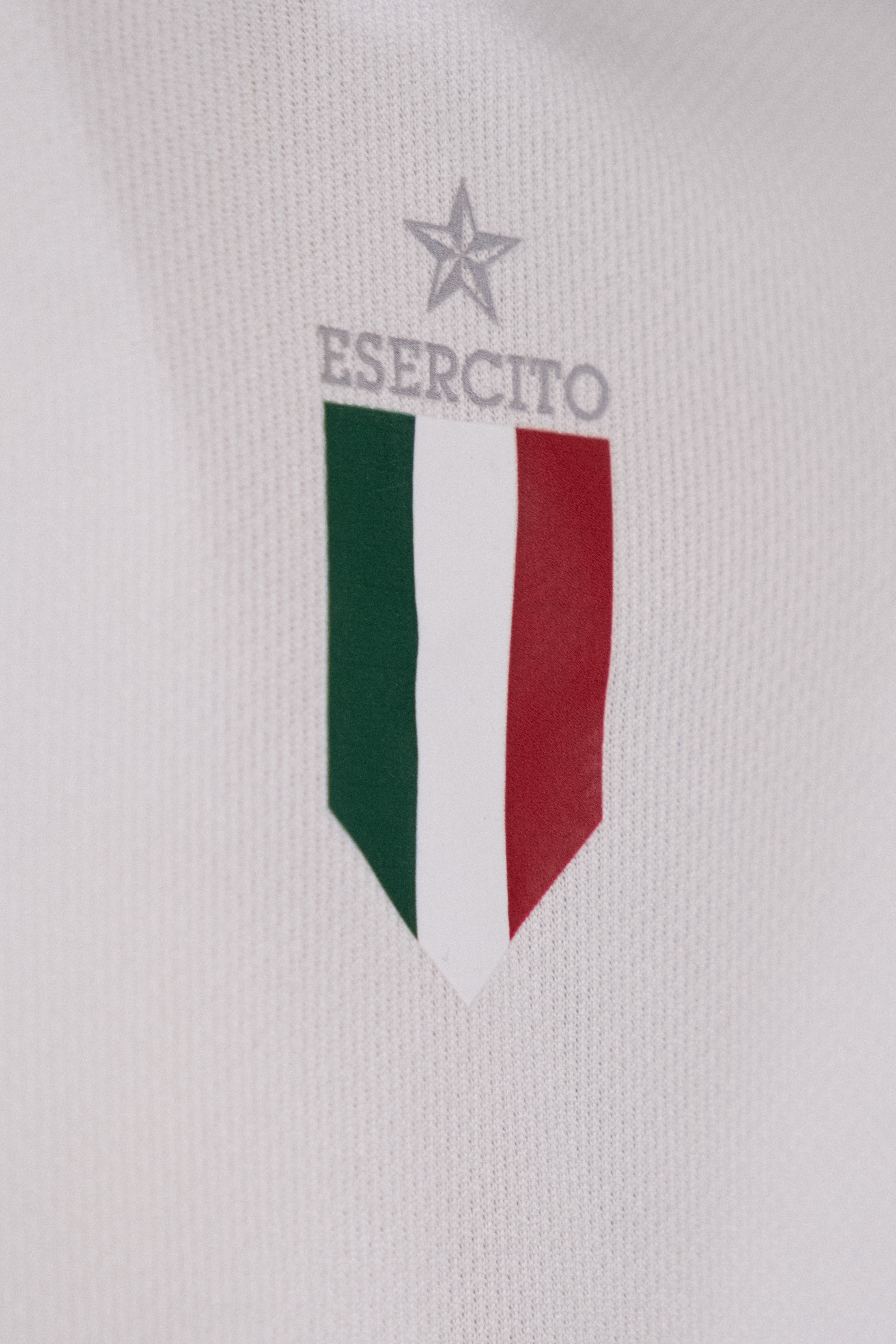 Men's short-sleeved technical polo shirt made of antibacterial recycled polyester. Ribbed collar and sleeves. Reinforced seam covers on the collar. Placket with two snap buttons. Contrasting shoulders and details. Side slits at the hem that improve the fit. Army logo and Tricolour.