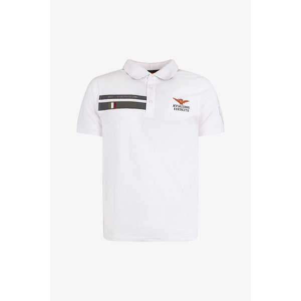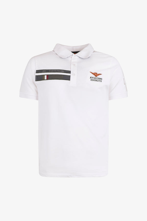 Piqué polo shirt, with collar and placket, side slits that improve the fit. Contrasting details and Aviazione Esercitopatches and embroidery in heart stitch. Embroidered logo on canvas patch, with burnished metal star, positioned on the left sleeve.