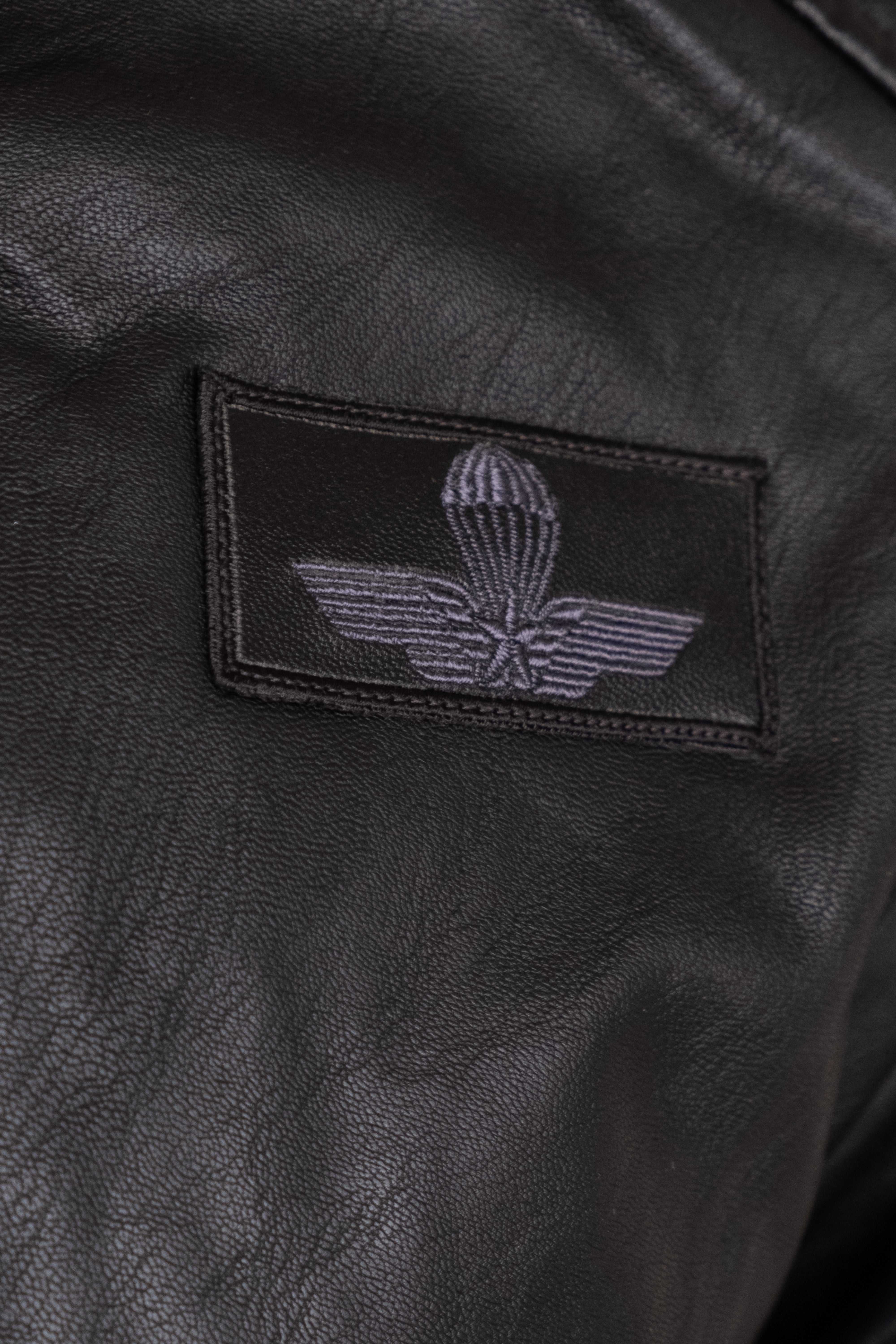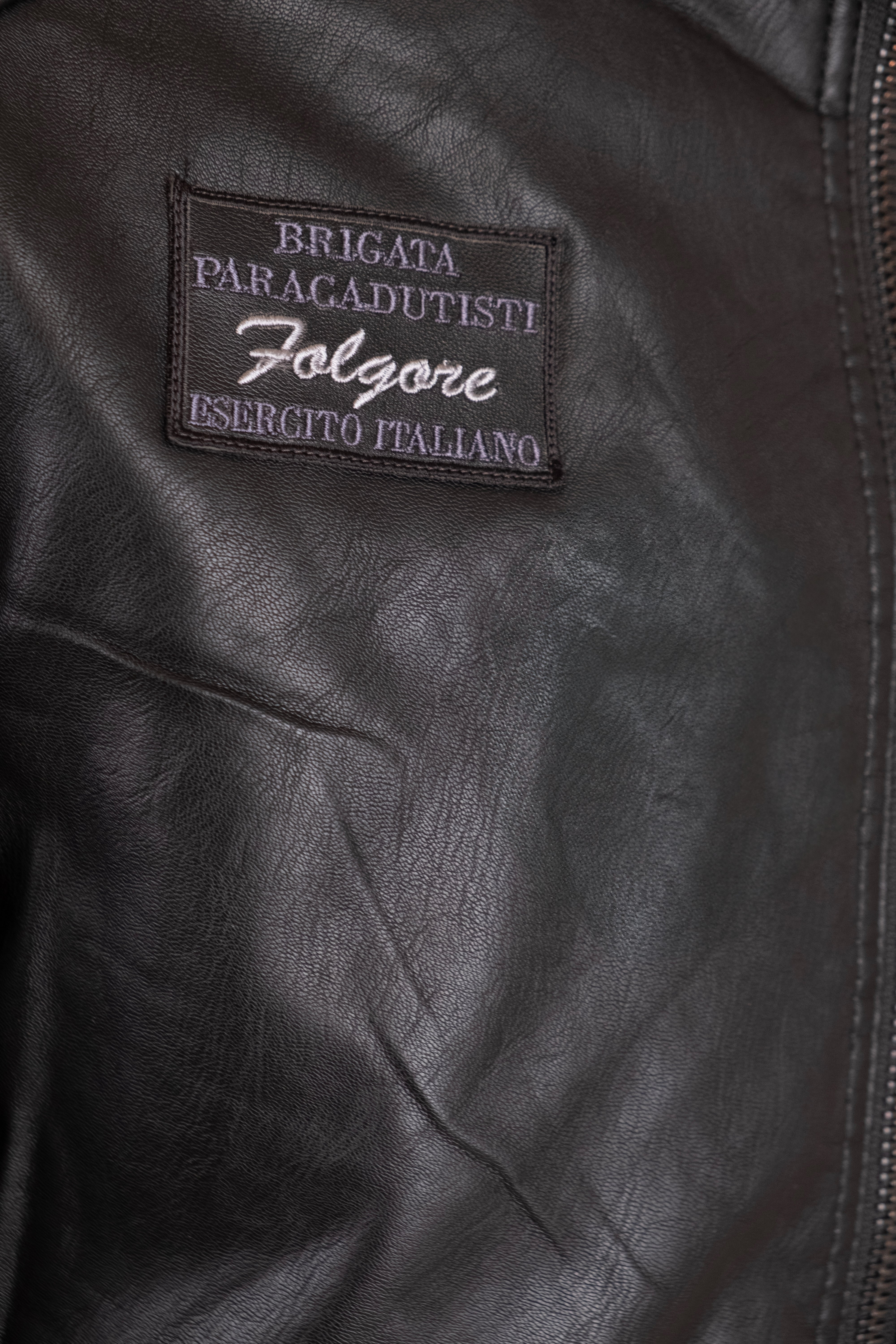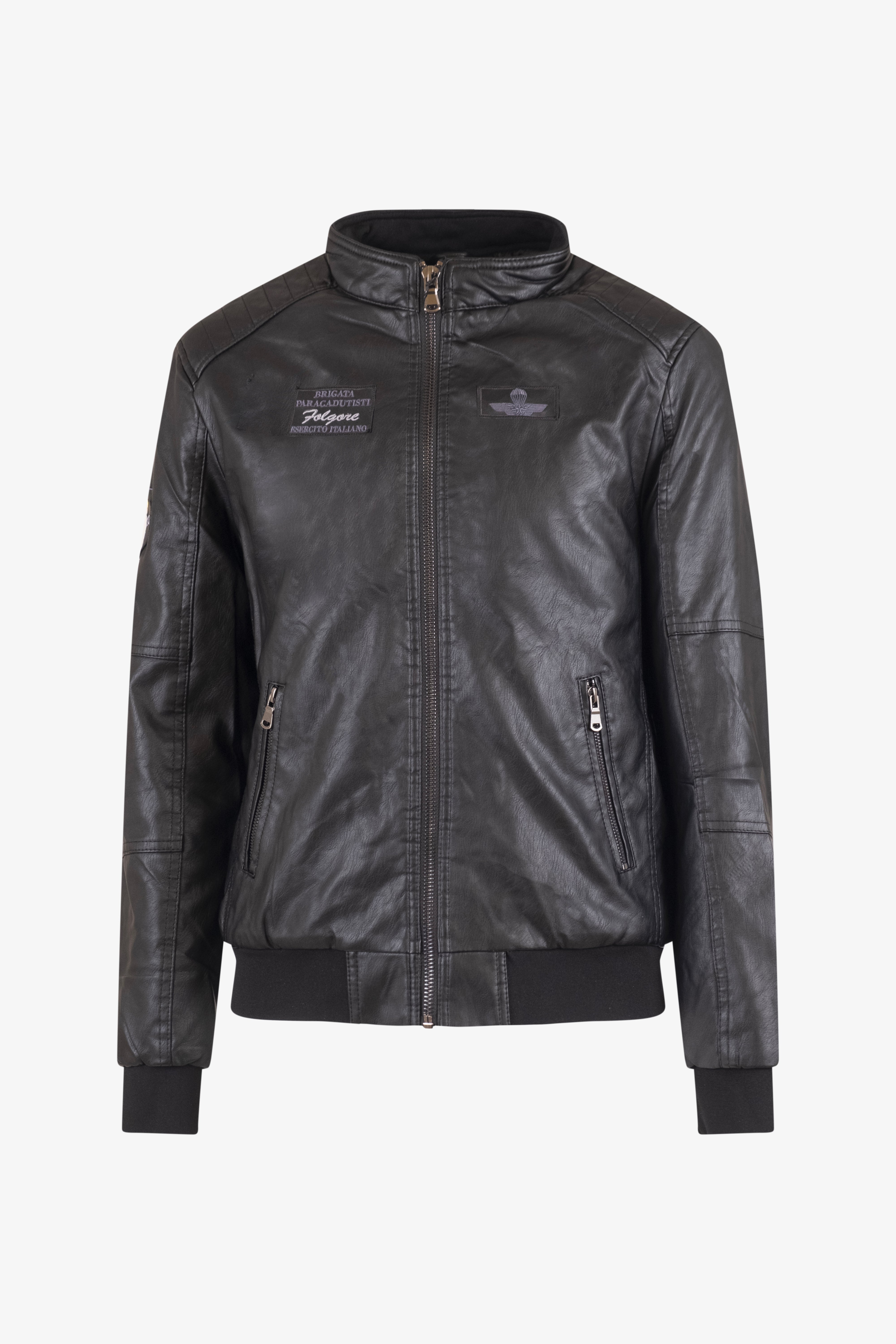 Make your outfit unique with this black eco-leather jacket, with a strong and modern design. Made of durable and easy to maintain material, it combines practicality and urban style. The model features the Folgore logo in the heart point, while on the right another detail with the writing 'Brigata Paracadutisti Folgore'. The jacket features front closure and side zip pockets. The stitching on the shoulders and the high collar complete the look, giving a bold and contemporary touch.