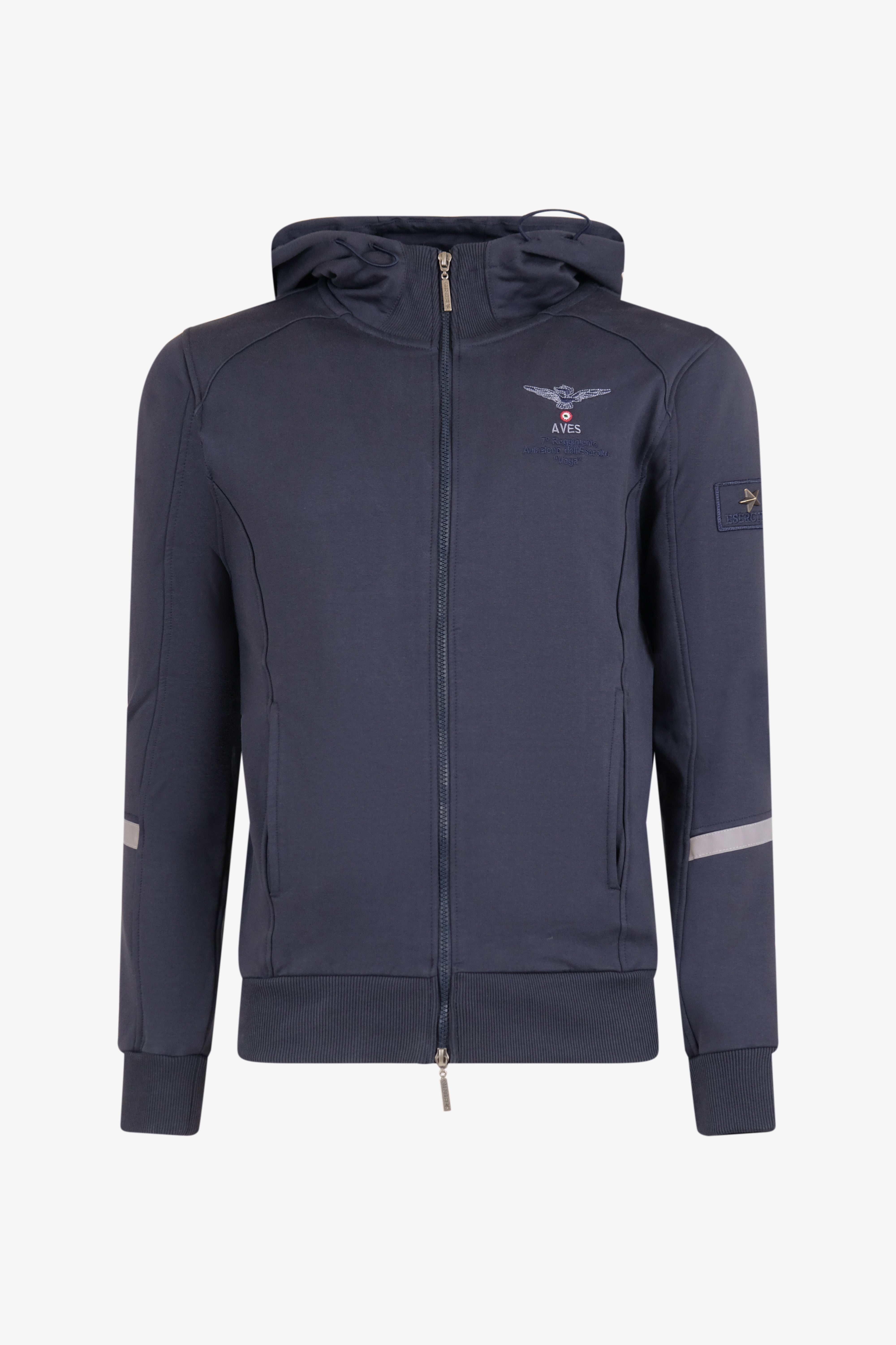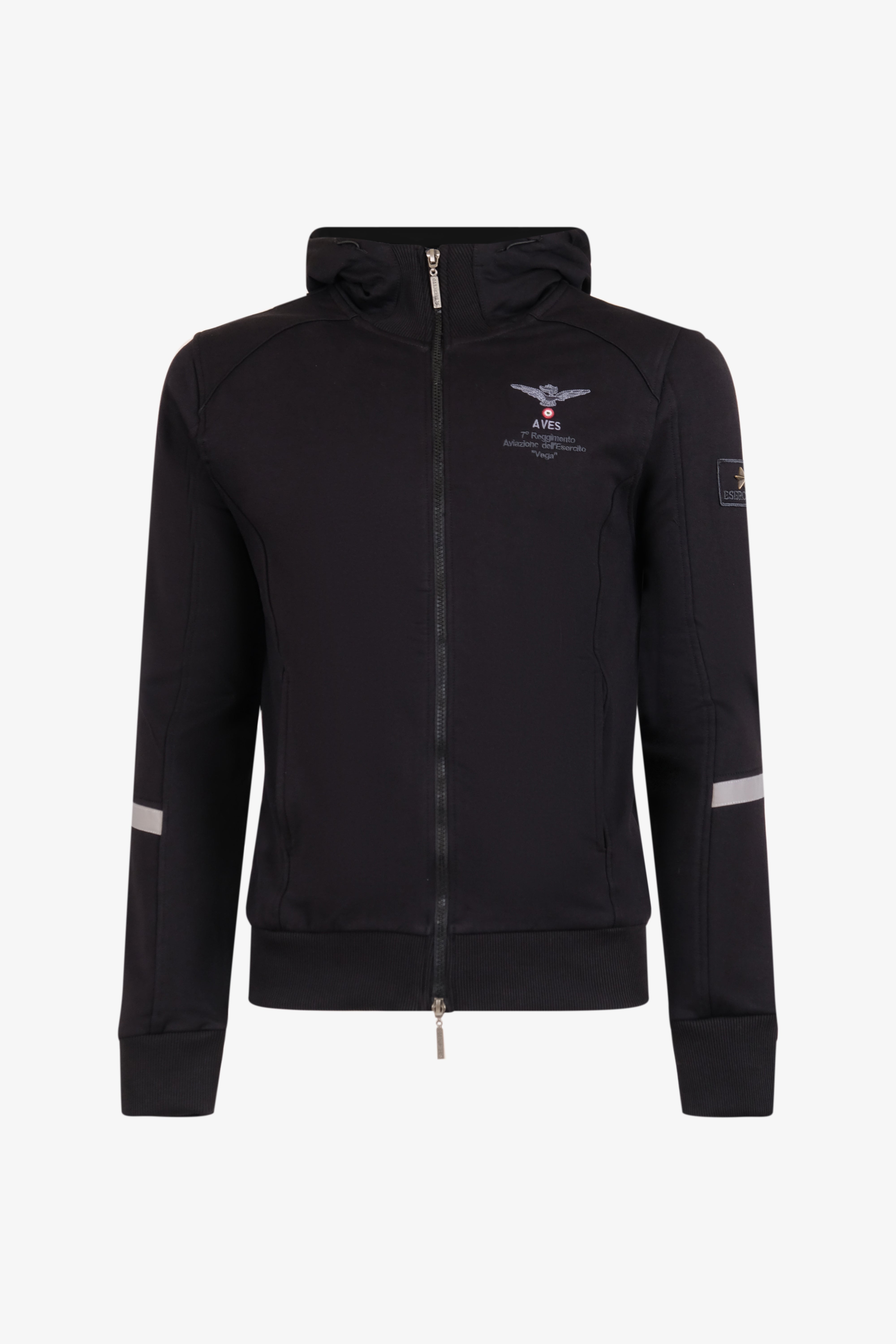 Men's full zip hooded sweatshirt, made of soft and resistant stretch cotton. It features two side pockets and embroidered details on the Aviazione Esercito chest. The sporty and functional design makes it ideal for leisure, sport and casual days, offering comfort and style on every occasion.